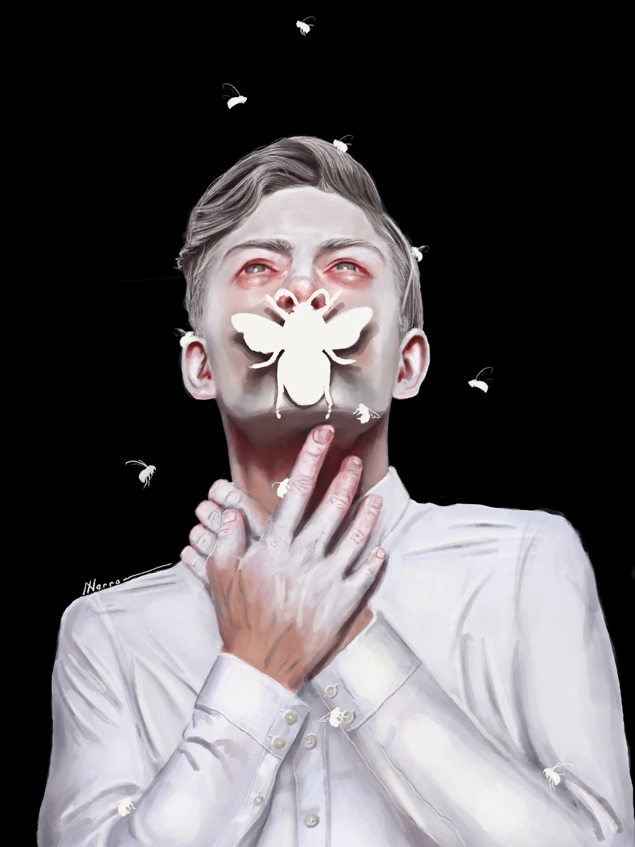Anaphylaxis (an-a-fi-LAK-sis) is a serious and life-threatening allergic reaction that happens within minutes to hours after exposure to an allergen. It can present as a red rash, swollen throat, wheezing, trouble breathing, pale color of the face, and a feeling of impending doom. This was my artistic approach to represent what I think of when I think of someone having an anaphylactic reaction.